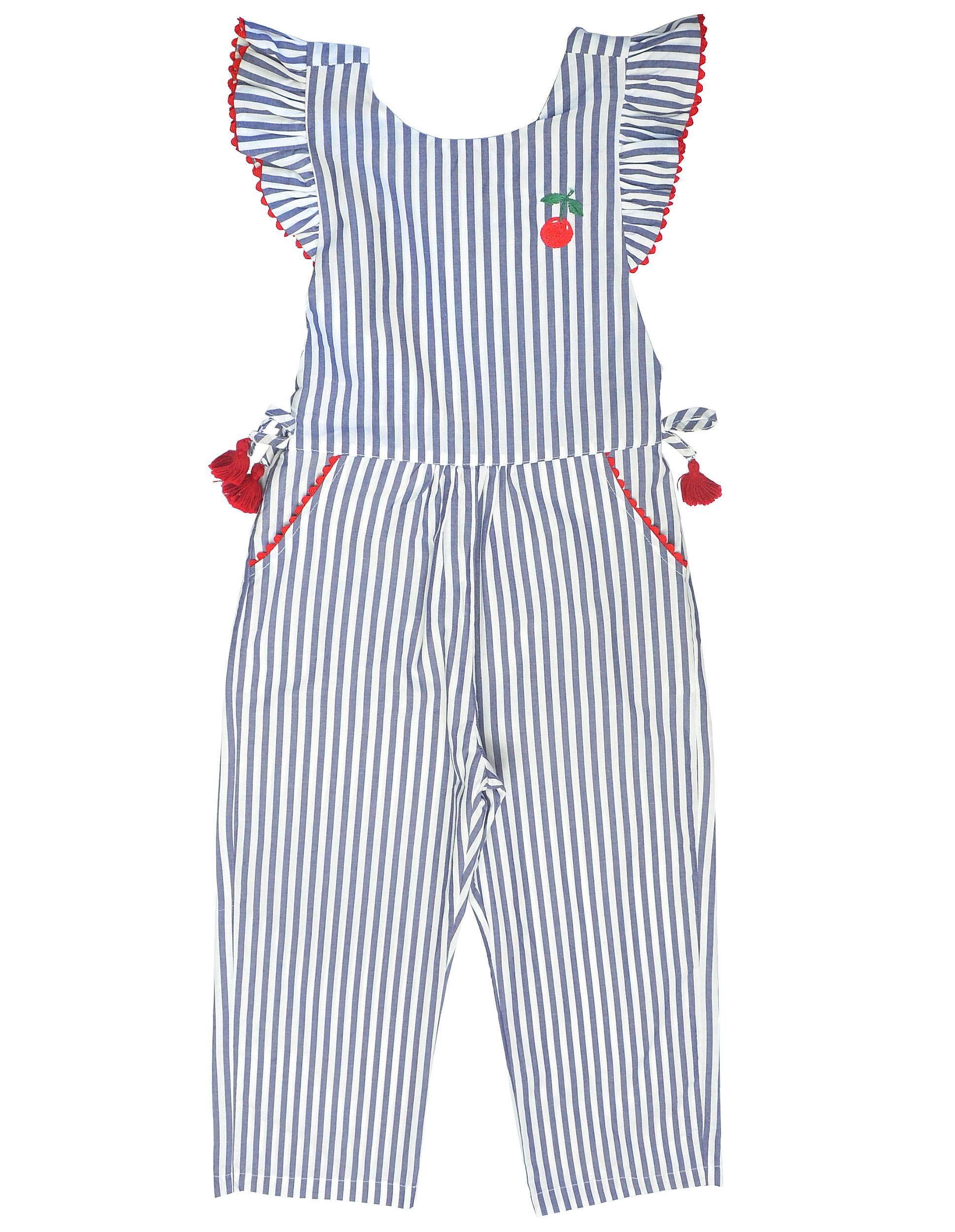 Macacão jardineira longo listrado, peitilho com babados nos ombros com detalhes de sianinha vermelha contrastante, bolsos faca, lacinho com enfeite tassel nas laterais, alças cruzadas com abotoamento nas costas, bordado de cerejinha feito à mão no peitilho, tecido fio tinto listrado marinho e off white, fio 50, macio e confortável.