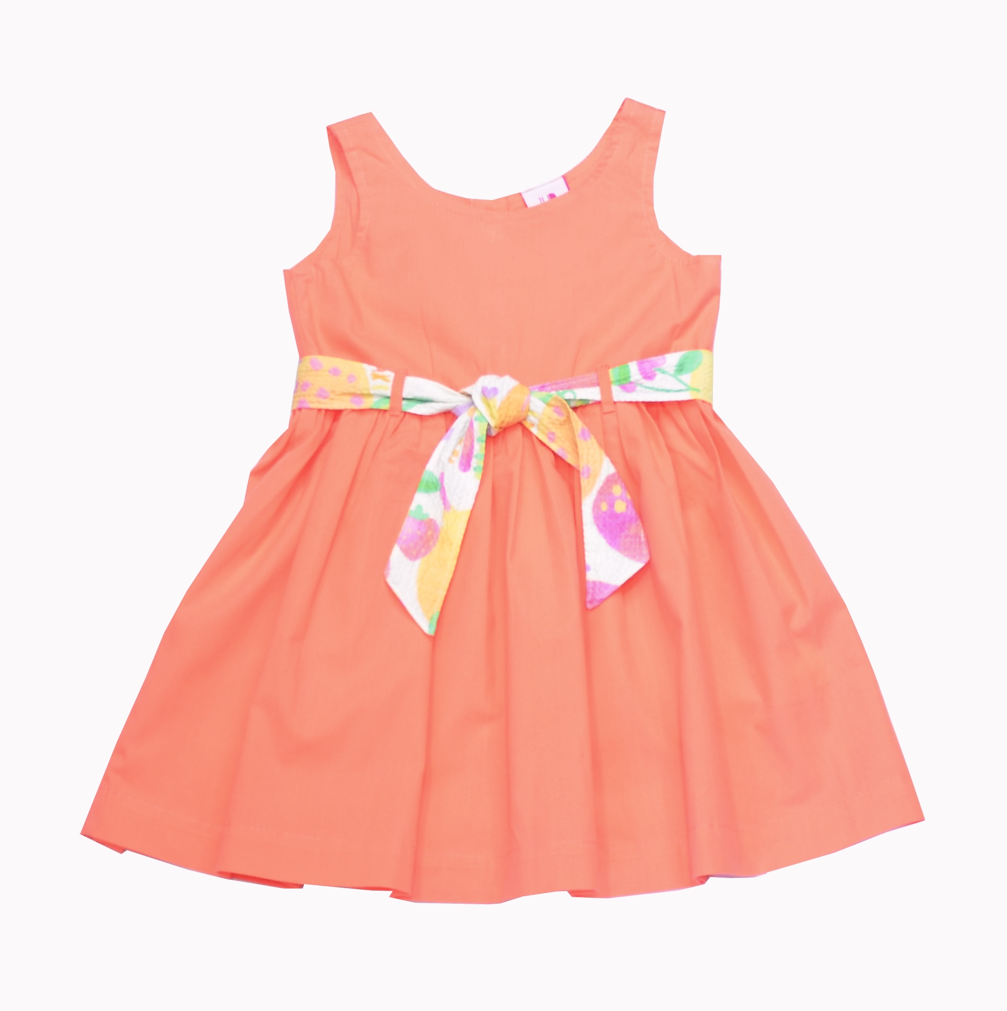 Vestido curto cavado, saia franzida, abotoamento nas costas com botões na cor da peça, passantes na cintura, faixa com nozinho estampada de frutas. Cores vibrantes, alegres, em tricoline macio 100% algodão. Fresquinho, gostoso, para todas as ocasiões.